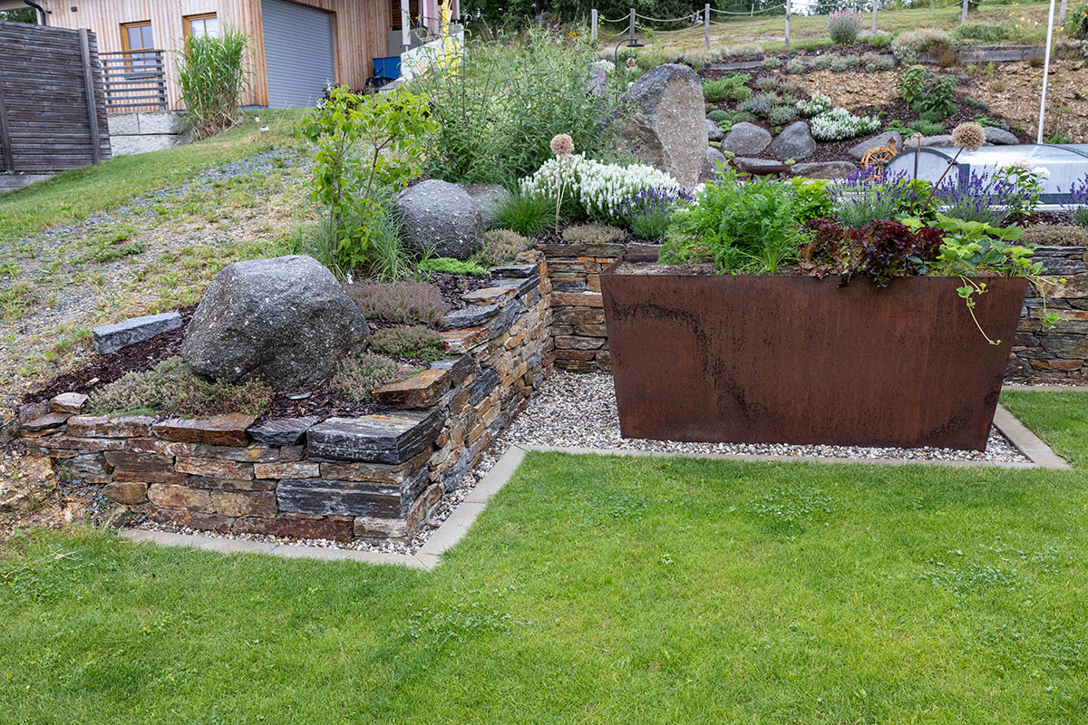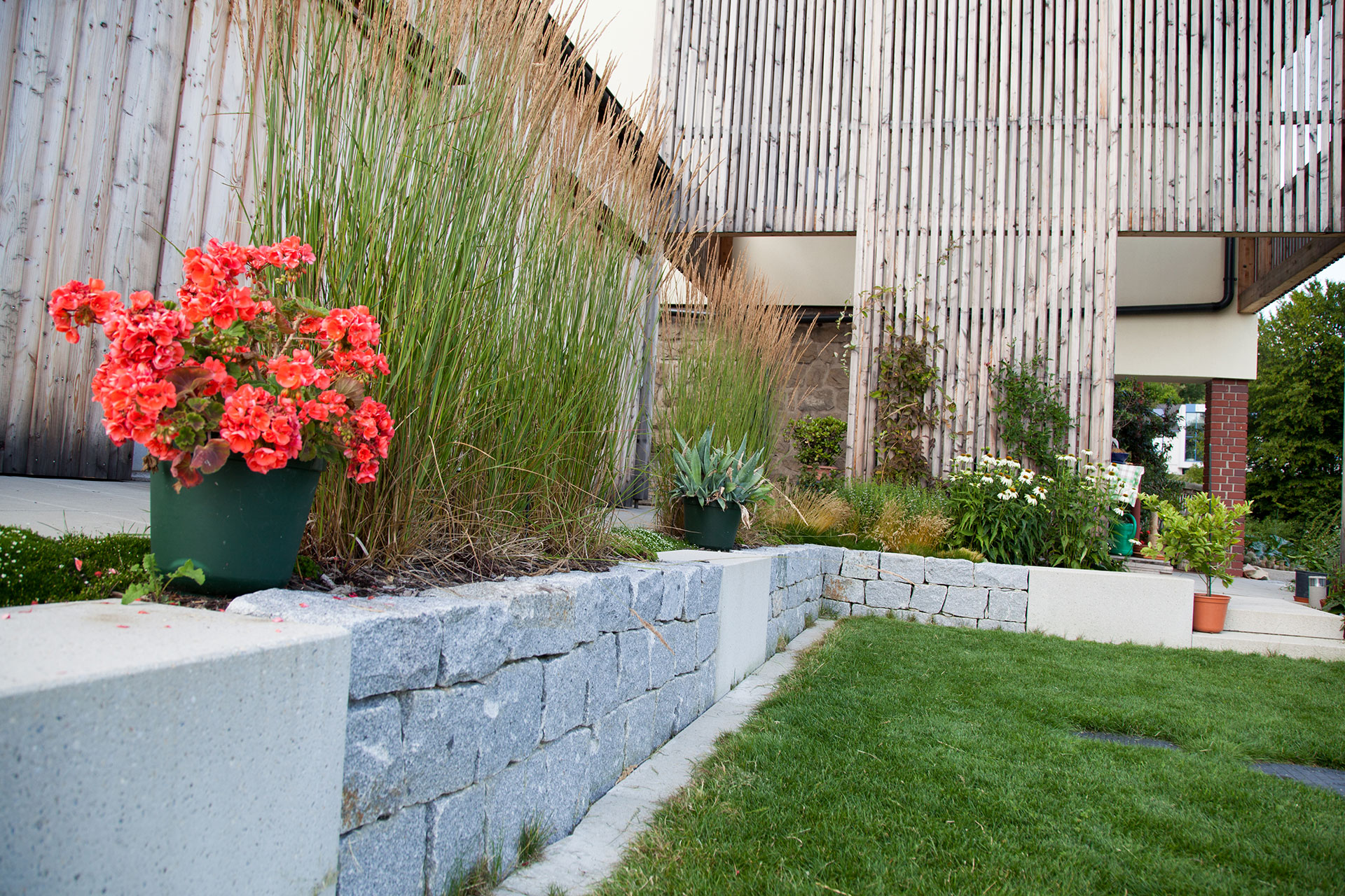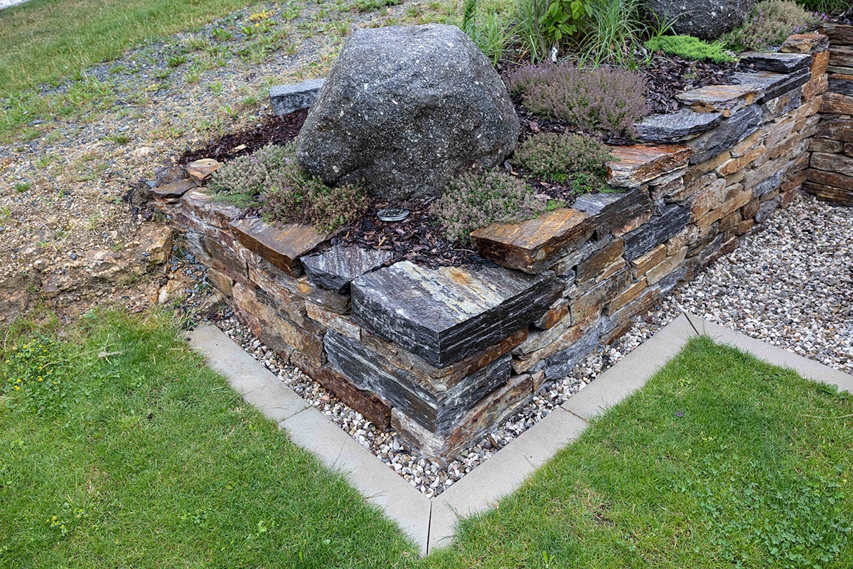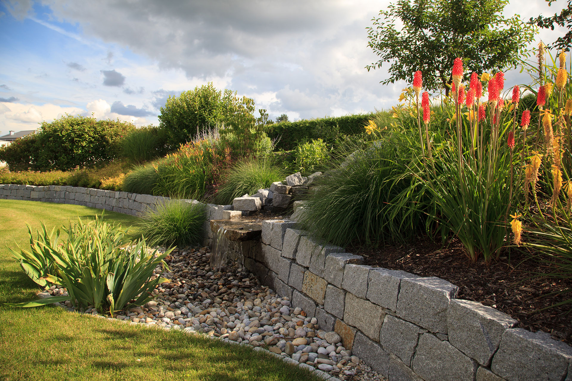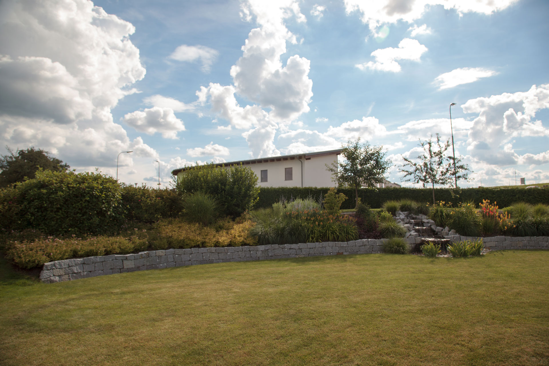 Planung, Geländemodellierungen mit Bagger, Trockensteinmauerbau, Plattenbeläge, sämtliche Pflasterarbeiten mit Natur- und Betonstein, Schwimmteich- und Naturpoolbau, Pflanzarbeiten, Rasenarbeiten.
