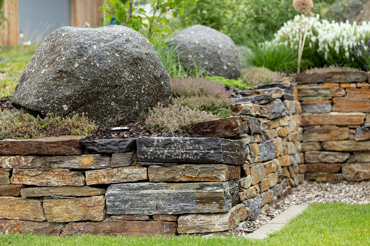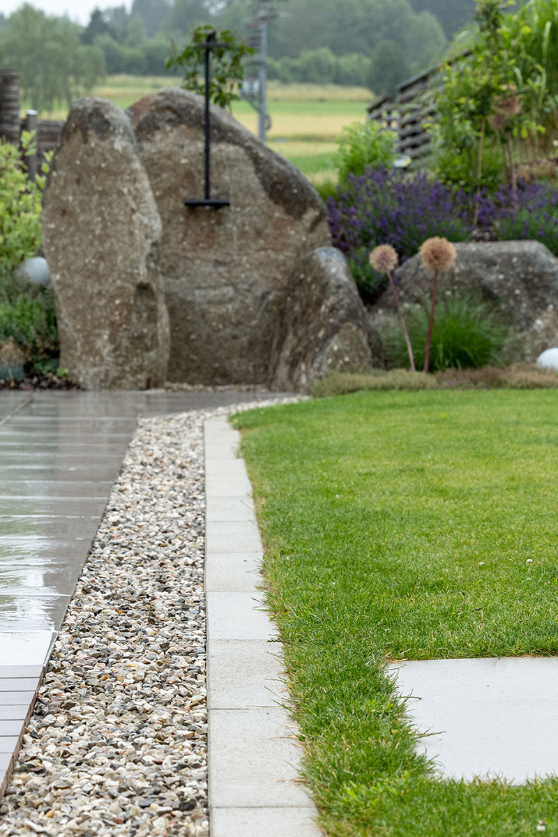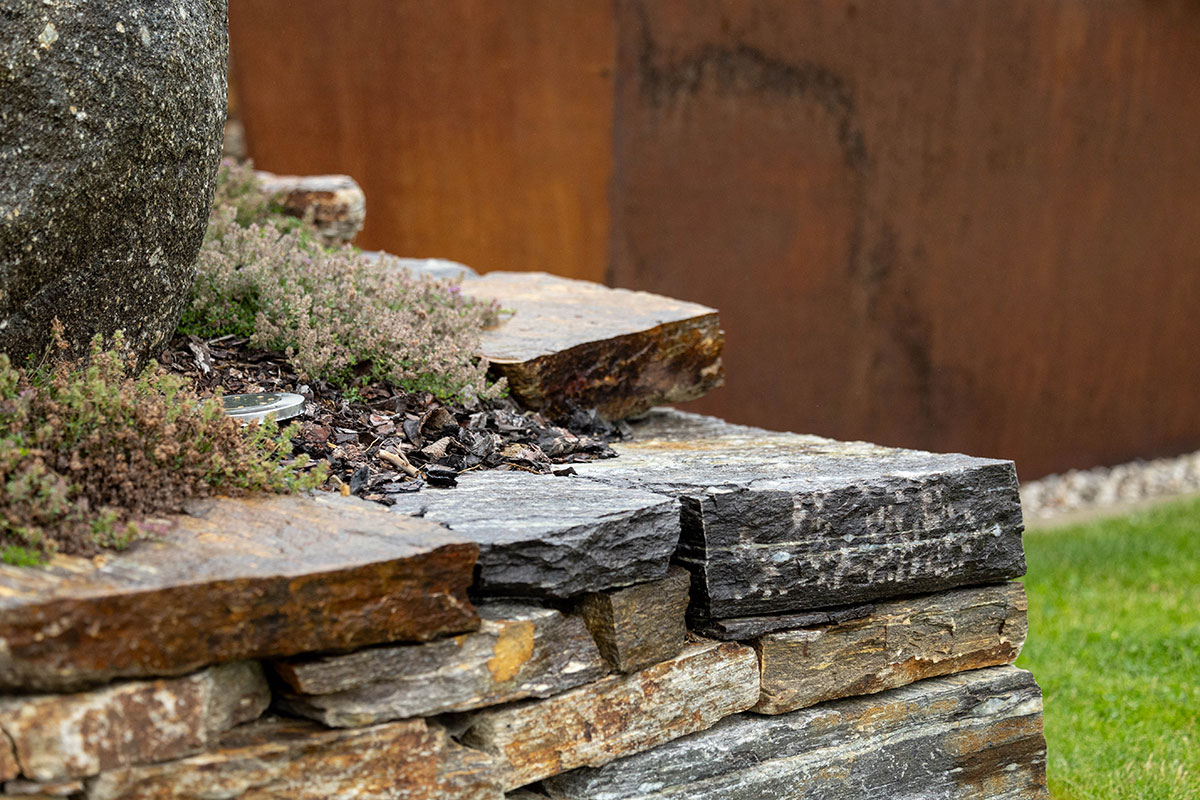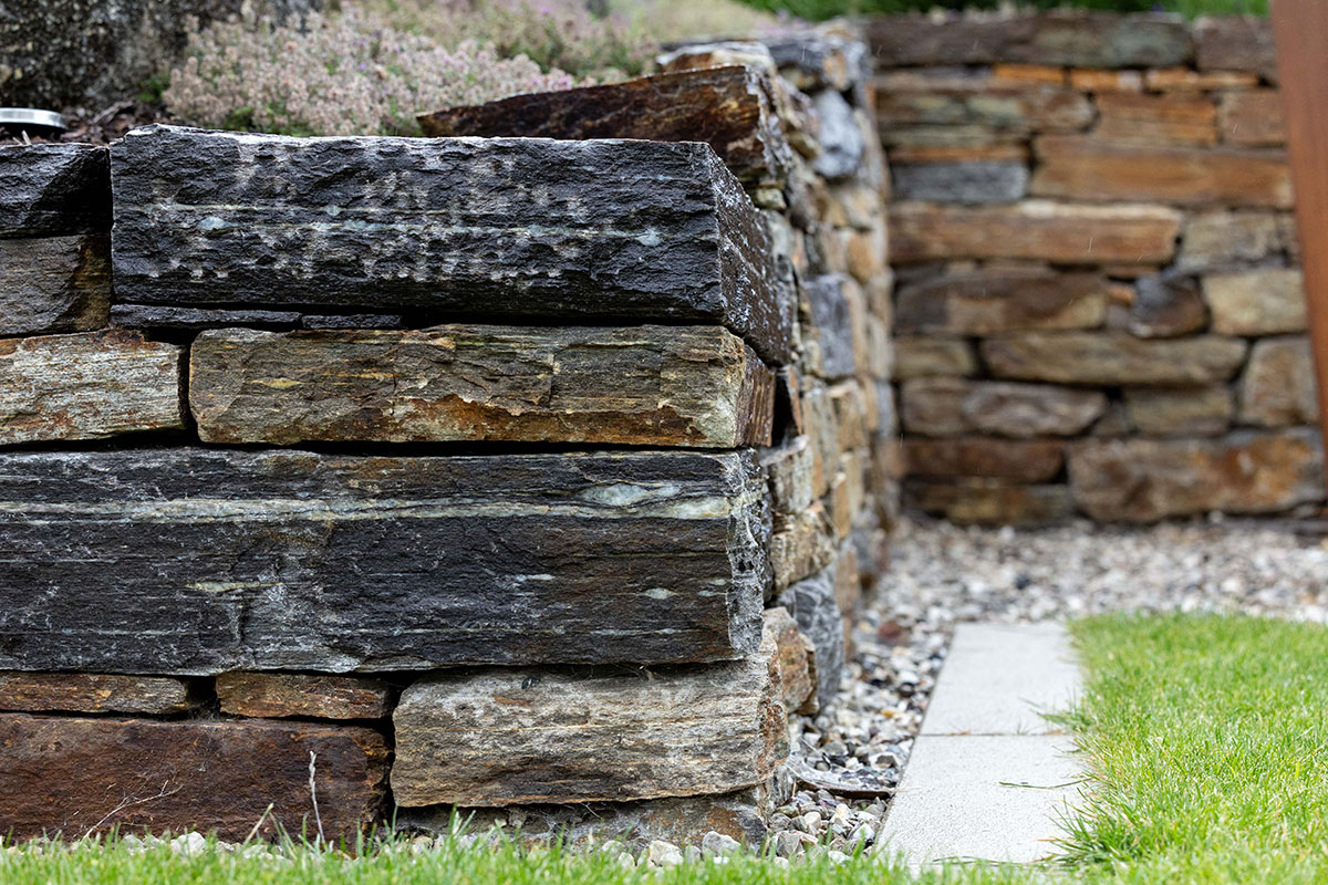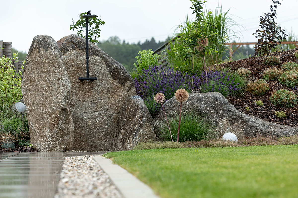 Seit Urzeiten hat der Mensch eine enge Bindung zur Natur, ganz besonders zum Element Stein – ein Gegenpol zu den fließenden Formen des Wassers. In der Gartengestaltung sind Natursteinpflasterungen und zeitlose Natursteinmauern wieder sehr gefragt. Als lässiges Gestaltungselement eignen sich auch Großformatplatten aus Sichtbeton und große Betonfertigteile.