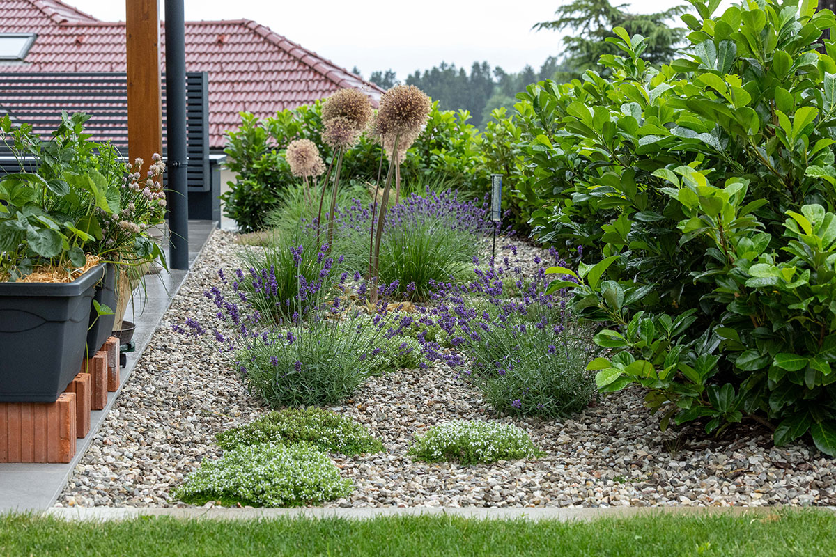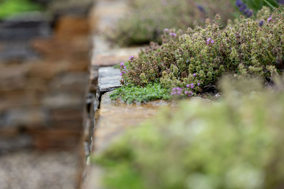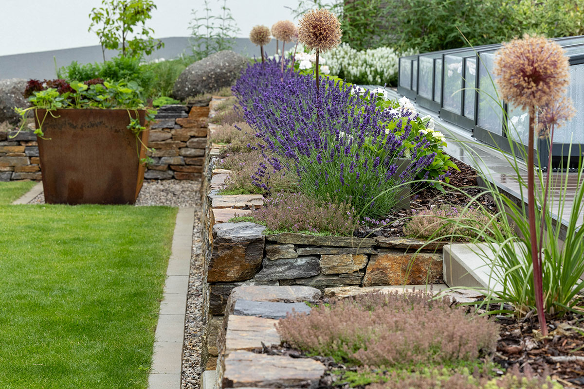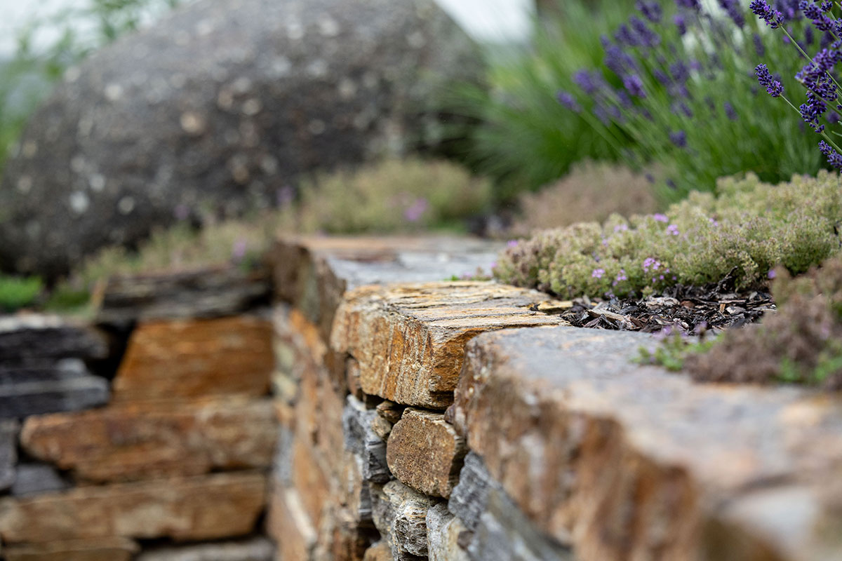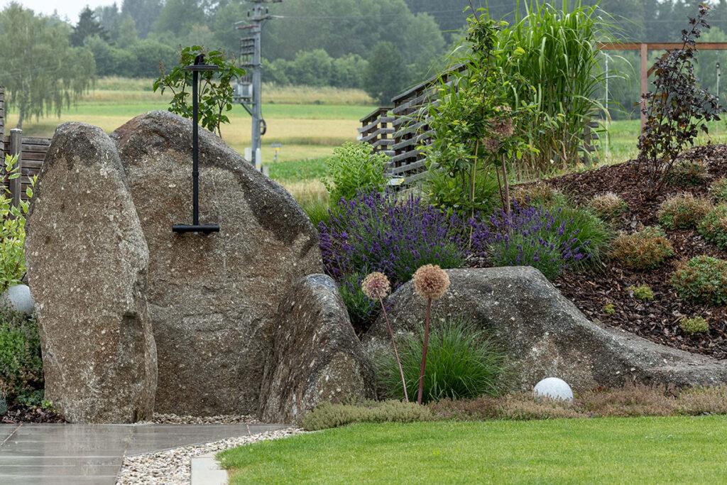 Seit Urzeiten hat der Mensch eine enge Bindung zur Natur, ganz besonders zum Element Stein – ein Gegenpol zu den fließenden Formen des Wassers. In der Gartengestaltung sind Natursteinpflasterungen und zeitlose Natursteinmauern wieder sehr gefragt. Als lässiges Gestaltungselement eignen sich auch Großformatplatten aus Sichtbeton und große Betonfertigteile.